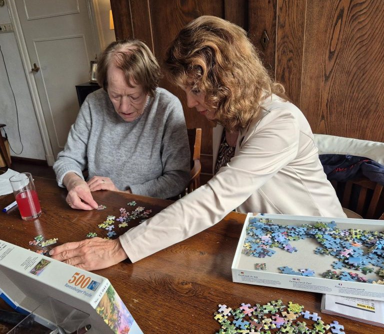 Zoon van client: "Nu al een paar maanden wordt er zorg gedragen voor mijn (demente) moeder in haar eigen woning. In de vorm van puzzelen, samen boodschappen doen, koffie leuten, een wasje draaien, etc. Momenten dat ikzelf niet langs mijn moeder kan gaan, kan ik altijd een bericht doen of er vanuit ‘Maatje dichtbij’ iemand langs kan gaan bij haar. De communicatie is zeer laagdrempelig en we komen dan altijd tot een oplossing. Dit zorgt ervoor dat mijn moeder nog in haar eigen huis kan blijven wonen. De lange- /eenzame dagen worden hierdoor doorbroken en dat geeft tevens een gerust gevoel. Ook mede door de wetenschap dat mijn moeder in zeer goede handen is. We zijn super blij met de flexibele service en zorg van ‘Maatje Dichtbij’. ‘Maatje dichtbij’ kan ik ten zeerste aanraden in een situatie waar meer zorg gewenst is voor een naaste!